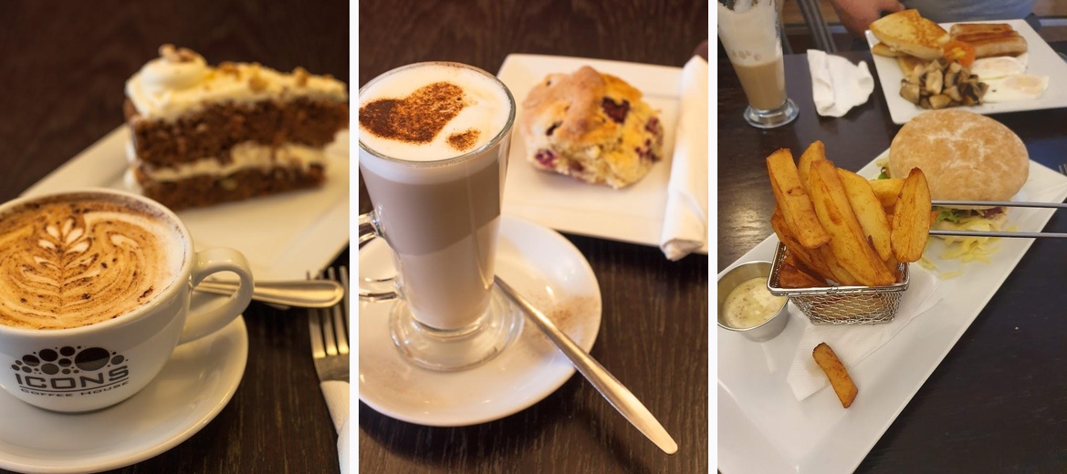 Icons specializes in coffee, breakfast, brunch, and lunch. Their menu includes options like cappuccinos, omelettes, and a variety of traybakes.